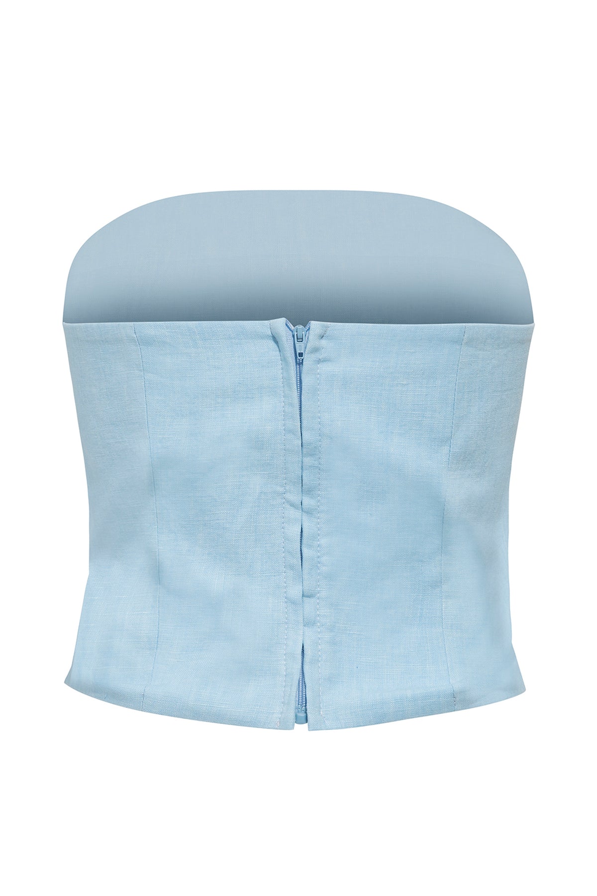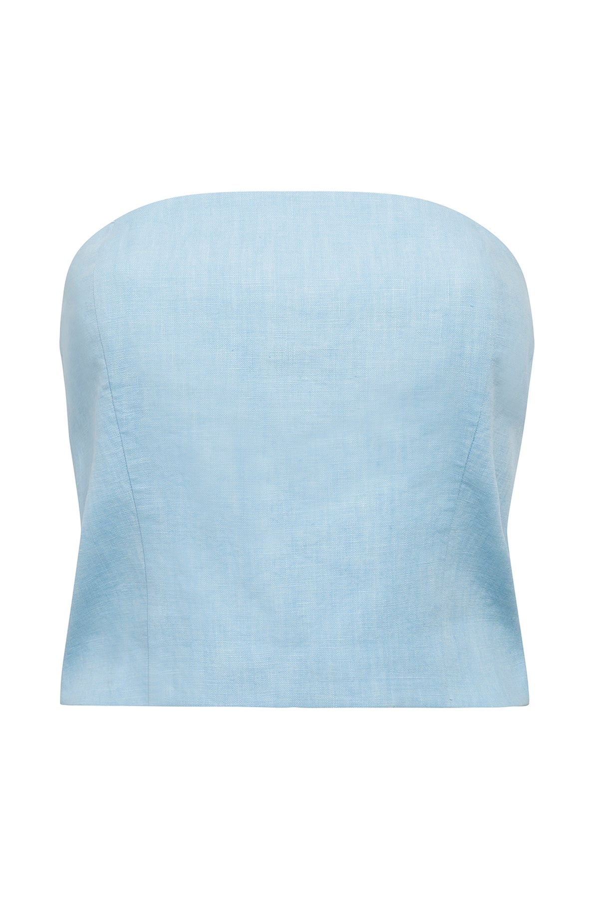 SELMACILEK Blue Linen Strapless Top is hand tailored for the SS26 collection.