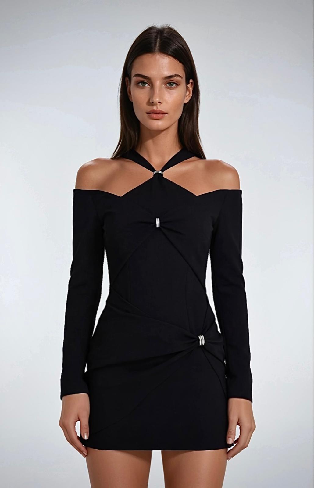 SELMACILEK Black Long-Sleeve Mini Dress with Accessory Detail, hand-stitched for the FW25/26 collection.
