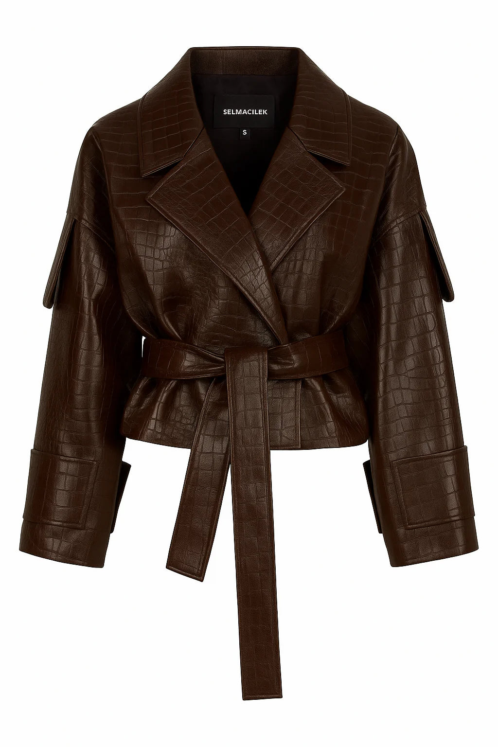 SELMACILEK Brown Croc-Embossed Vegan Leather Short Jacket with Shoulder Details and Waist Tie Handcrafted for the Fall/Winter 2025 Collection.